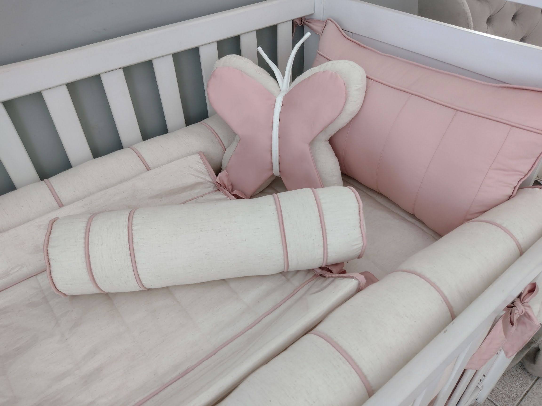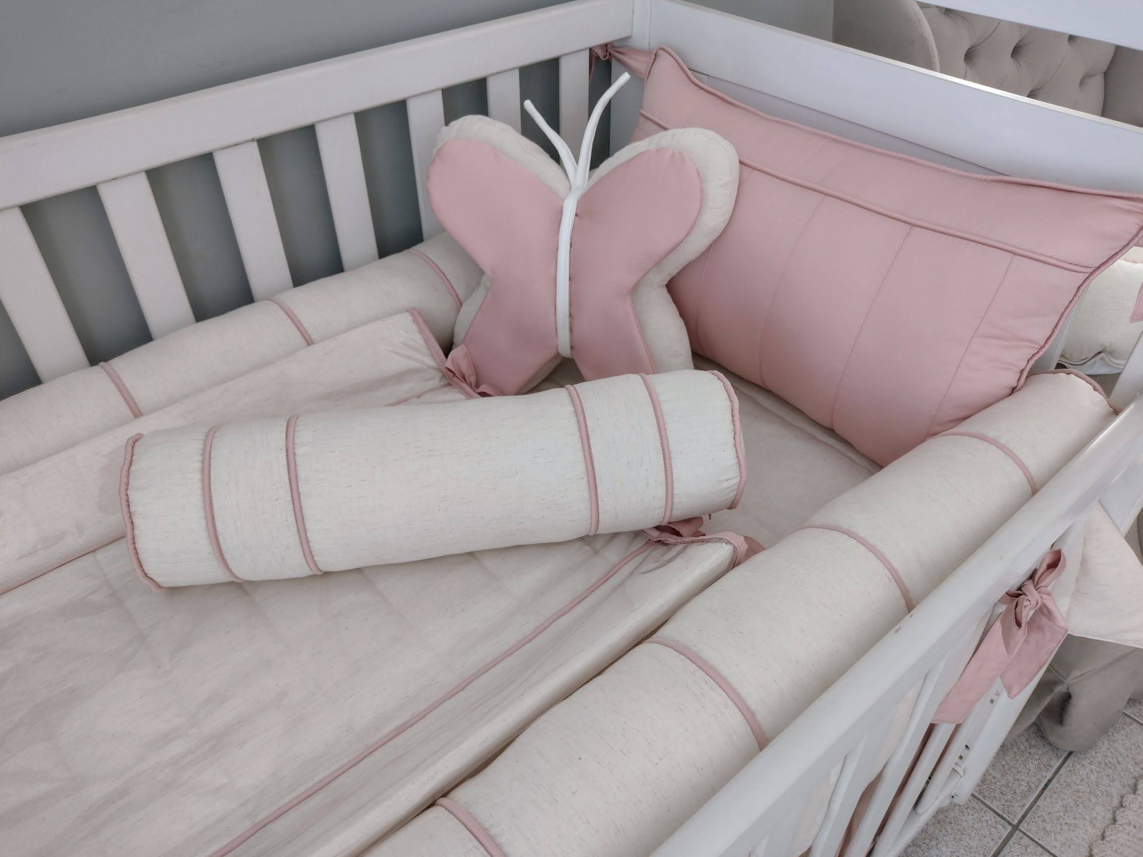 Kit Berço feito com tecidos Percal 400 fios Linho, Sarja Leve, Tricoline tudo de algodão, antialérgico com longa duração de uso. Os recheios são feitos com fibra siliconada ou espuma com densidade 23, proporcionando conforto e segurança ao bebê dentro do berço!