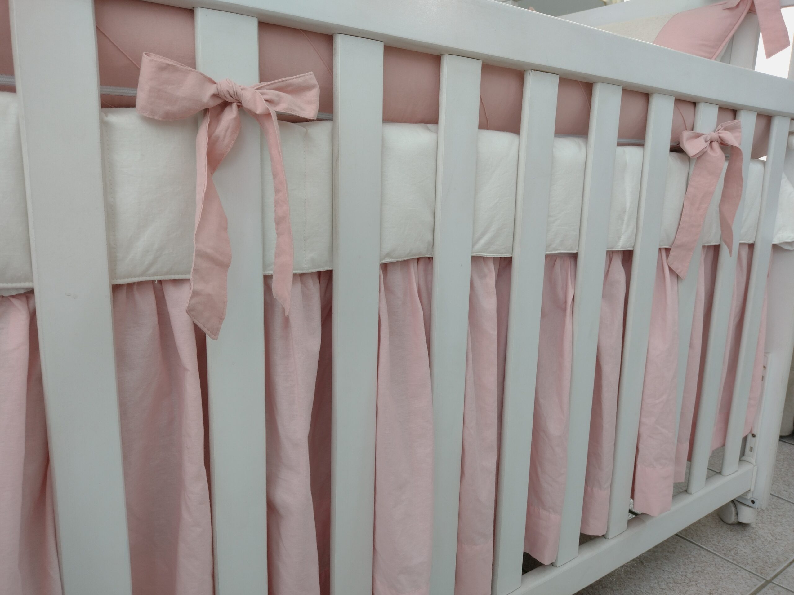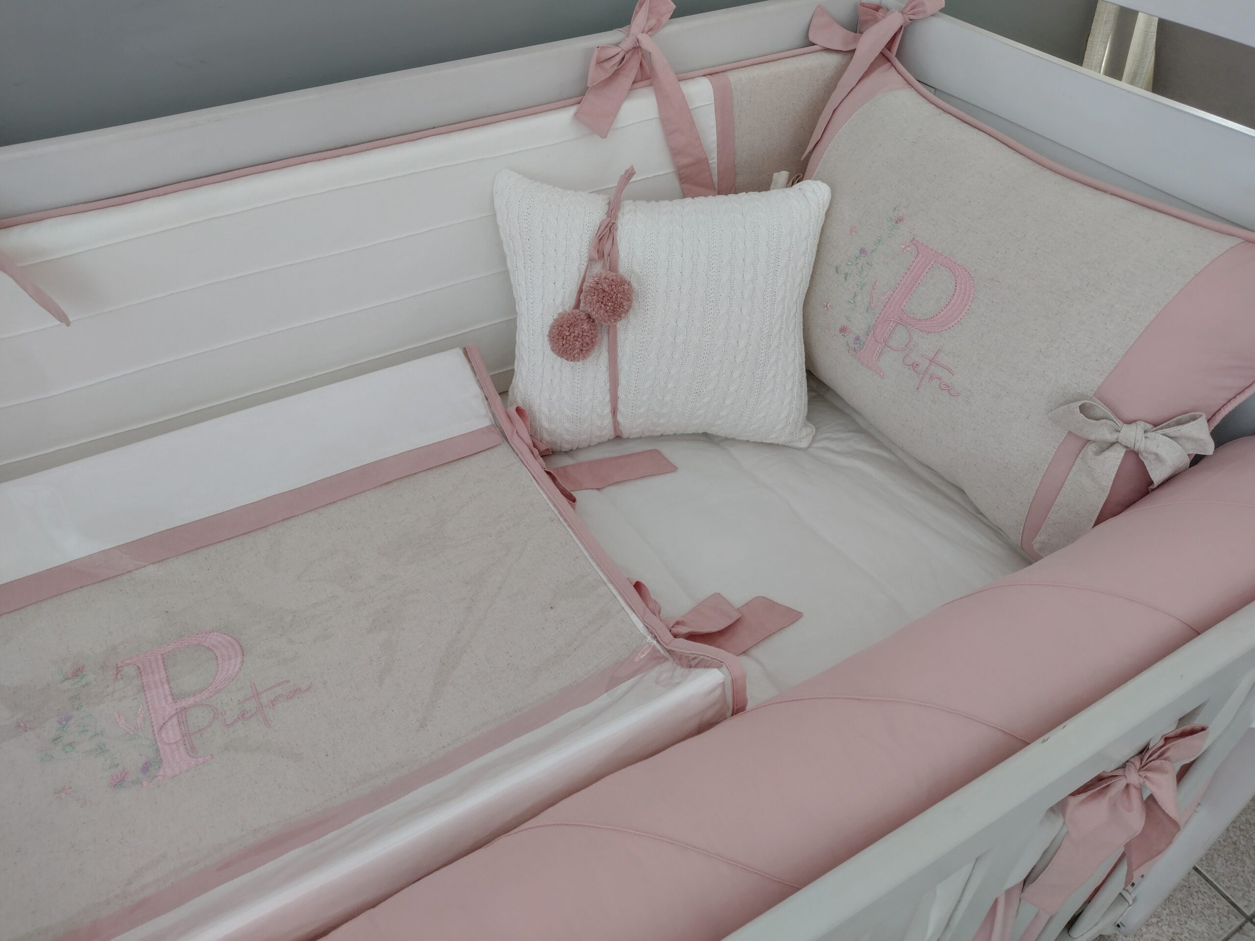 Kit Berço feito com tecidos Percal 230 fios Linho, Sarja Leve, Tricoline tudo de algodão, antialérgico com longa duração de uso. Os recheios são feitos com fibra siliconada ou espuma com densidade 23, proporcionando conforto e segurança ao bebê dentro do berço!