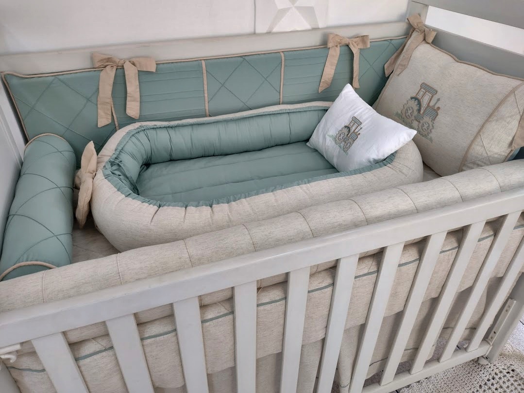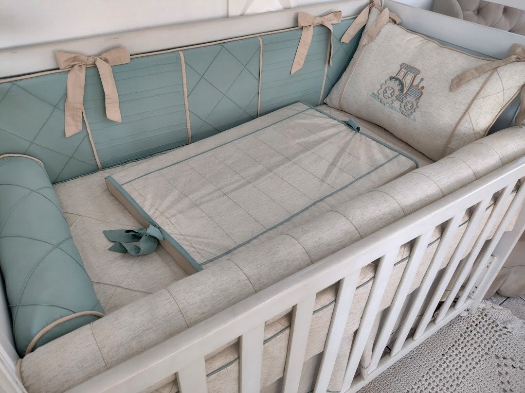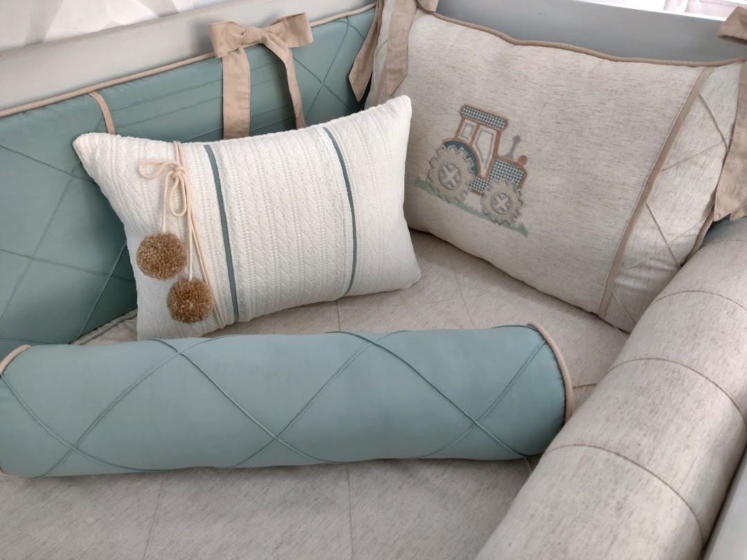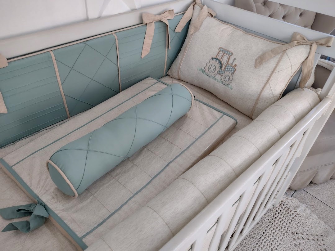 Kit Berço feito com tecidos Percal 400 fios Linho, Sarja Leve, Tricoline tudo de algodão, antialérgico com longa duração de uso. Os recheios são feitos com fibra siliconada ou espuma com densidade 23, proporcionando conforto e segurança ao bebê dentro do berço!
