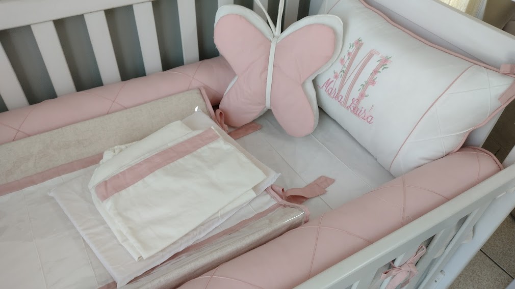Kit Berço feito com tecidos Percal 230 fios, Sarja Leve, Tricoline tudo de algodão, antialérgico com longa duração de uso. Os enchimentos são feitos com fibra siliconada ou espuma com densidade 23, proporcionando conforto e segurança ao bebê dentro do berço!